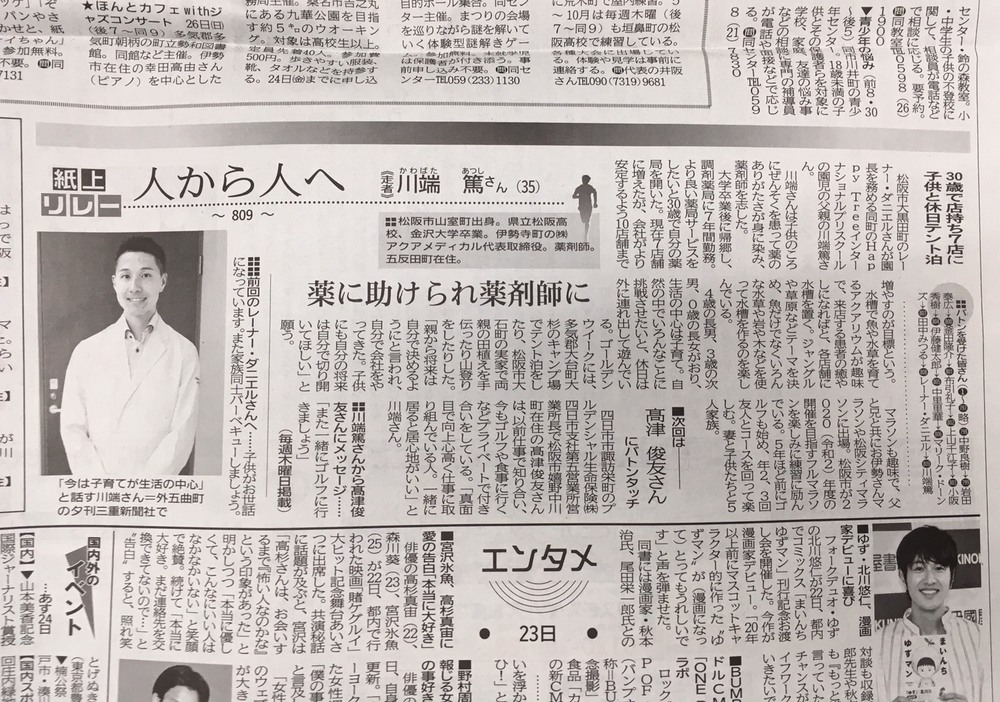 松阪の地方新聞、夕刊みえの「人から人へ」の記事にご紹介頂きました
